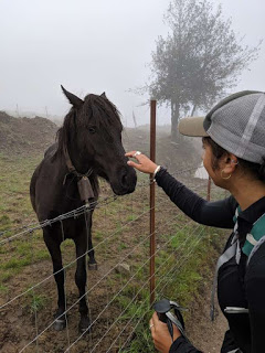 There were highlights though! We were hiking through a combination of farm country and dense forests, but extremely muddy. While going through a small farm area we saw four black horses who ran towards us from behind their fence and let us pet them. The horse petting is really becoming a highlight for me on this trip. I’m hoping that most days I’ll get to have that to look forward to. We also took a brief breakfast break in Olatz, a town with maybe two buildings and three houses, and ate cereal bars, some Gouda, and a really disgusting yogurt (not a highlight).