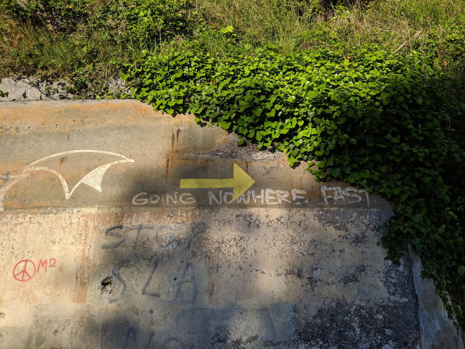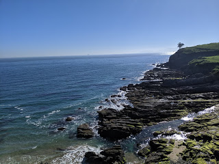 After the only big ascent and descent of the day we came to a hidden beach with a few people camping in vans right on the water. We decided it was a good spot to take a break for breakfast and watch the waves. There also happened to be a bench perfectly placed for us to watch the water and the dogs playing on the beach!