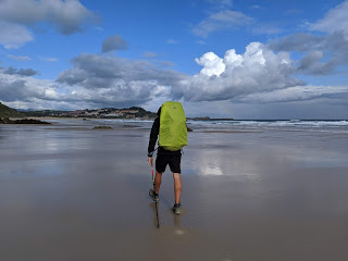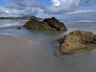 After that we were on a roll. Most of the path was on pavement, but it followed the ocean almost the whole way which was beautiful. The rain let up a bit so it was only lightly misting. The first part of the walk we went through a Nature Park with marshes, ponds, and lots of birds. Then we took a short cut and walked along the beach next to the waves for a few kilometers while others trudged up and down hills on the highway. At the end of the beach we sat on a bench looking out at the waves and ate breakfast. The surf was good, so we watched the locals while we enjoyed our fruit and yogurt.