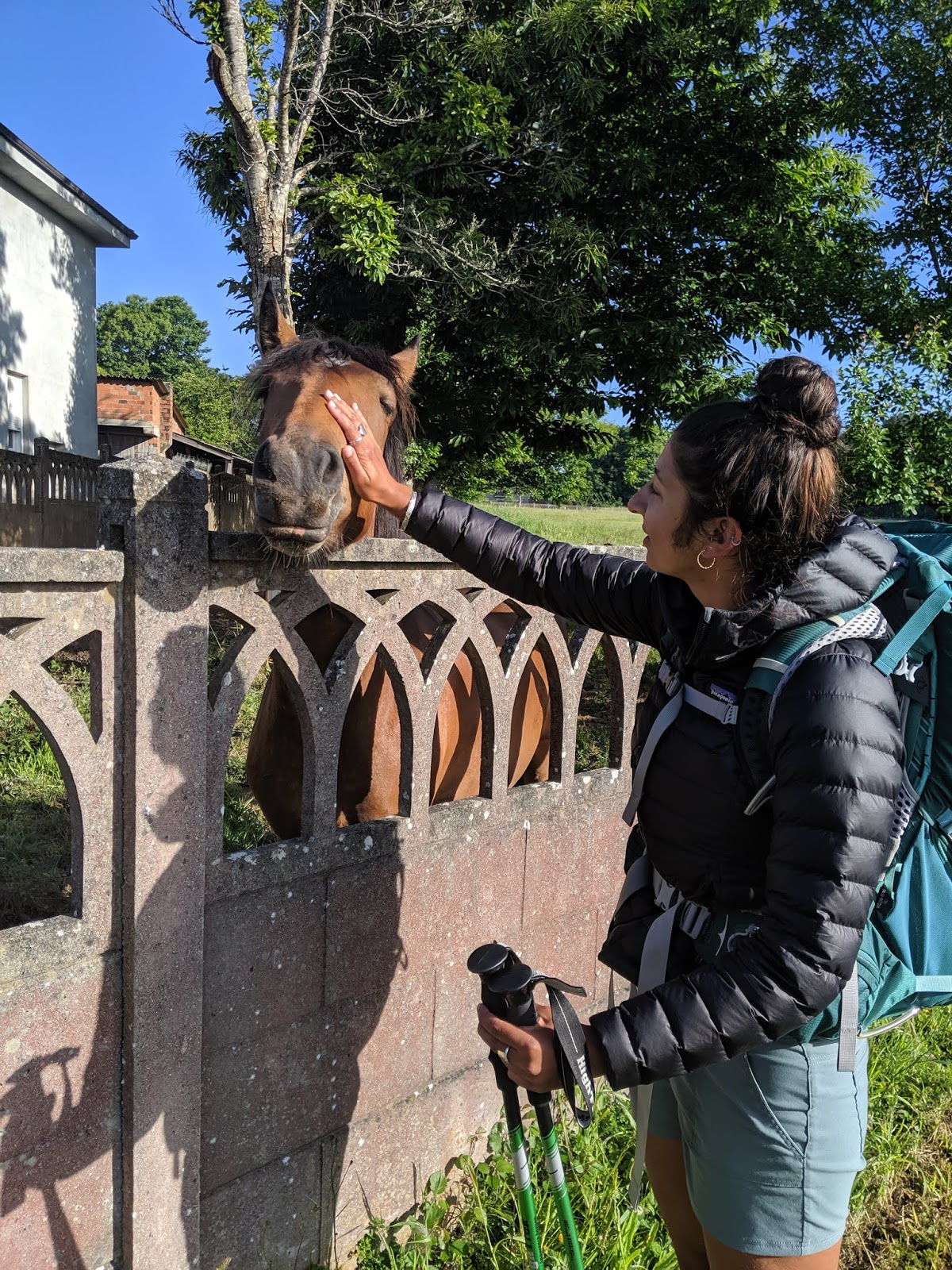 This morning was probably the coldest it’s been on the Camino since we started. We were alternating holding our hiking poles with one hand while warming up the other in our pockets for most of the morning. The upside of it though was a lot of the terrain was soft, the sky was clear, and the sun was shining. Oh and we met the most friendly horse thus far and we are under 100km to Santiago!