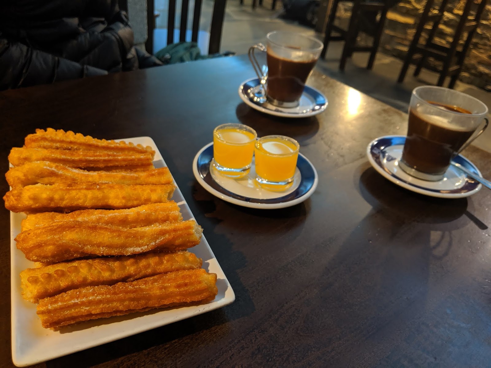 Today we were again in no rush when we woke up. We had lots of time to make it to our next city and the Albergue didn’t open til 13:00. So, we leisurely got our things together and then headed to the place we got churros yesterday to see if they’d be just as good in the morning. They were. They might’ve been even better because they had just opened when we order the chocolate and churros. Every time we eat churros con chocolate, I burn my tongue trying to quickly shovel all the hot chocolate in my mouth before Scott eats it all.