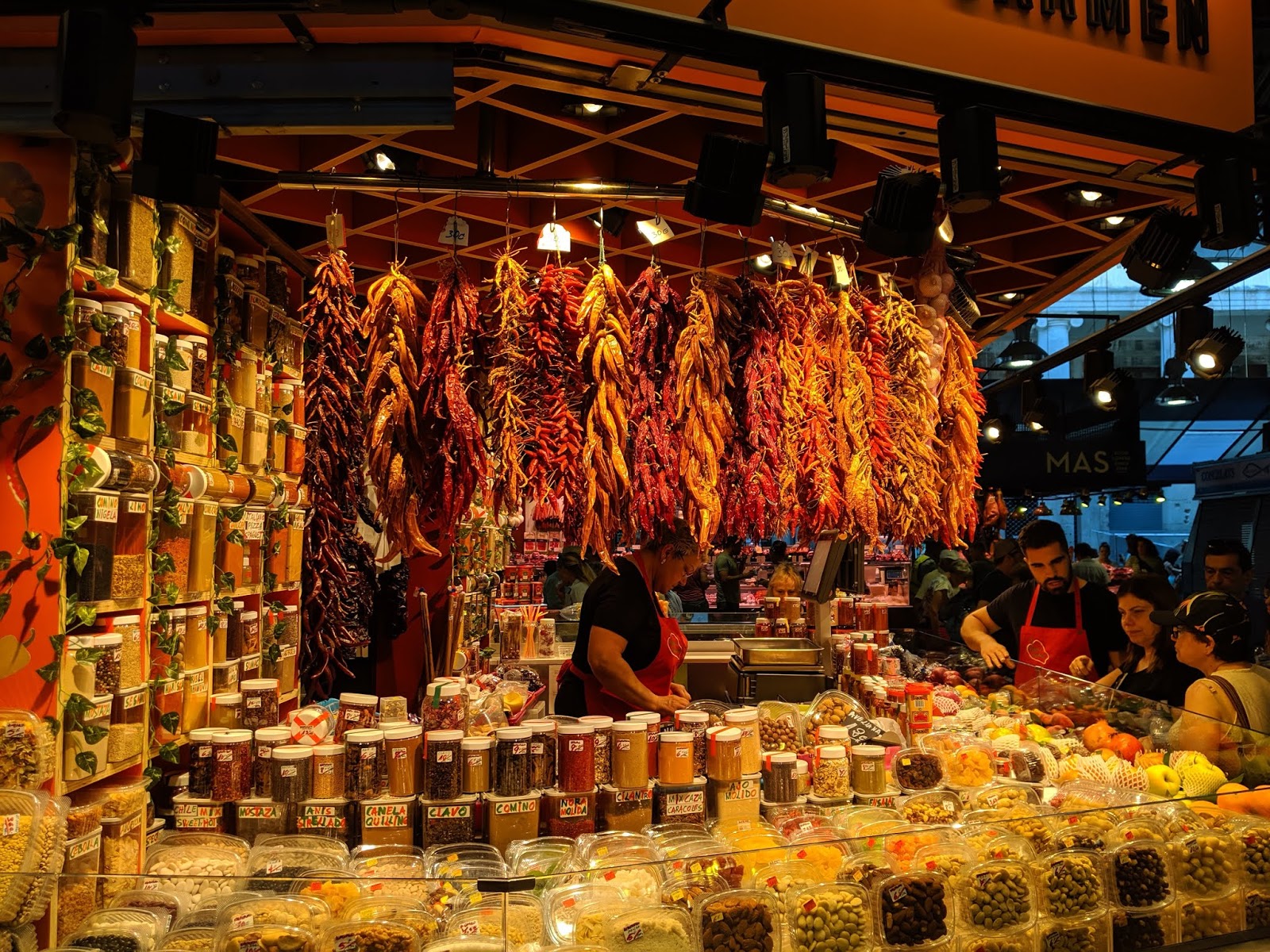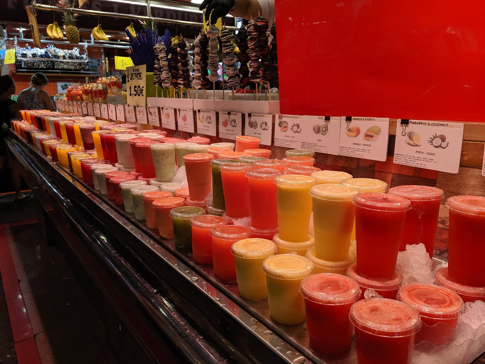From the beach we headed to the famous ‘Mercado de la Boqueria’ off of La Rambla (touristy street). Outdoor markets are always our favorite so we had to check this one out. My favorite thing about the market is going down every aisle, to be sure I don’t miss anything. I think Scott finds this quite tedious, but he also told me he loves how into it I am. The stalls are filled with fresh fruits, eggs, butchers, carnicerias, seafood, restaurants with random fried things, pastries, paellas, and smoothies. We’ve only got smoothies from there thus far, but I think tomorrow we’ll get some meat and cheese from one of the carnicerias.