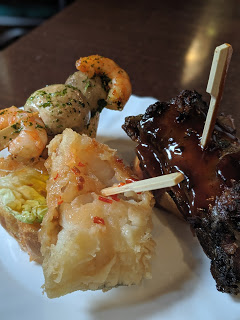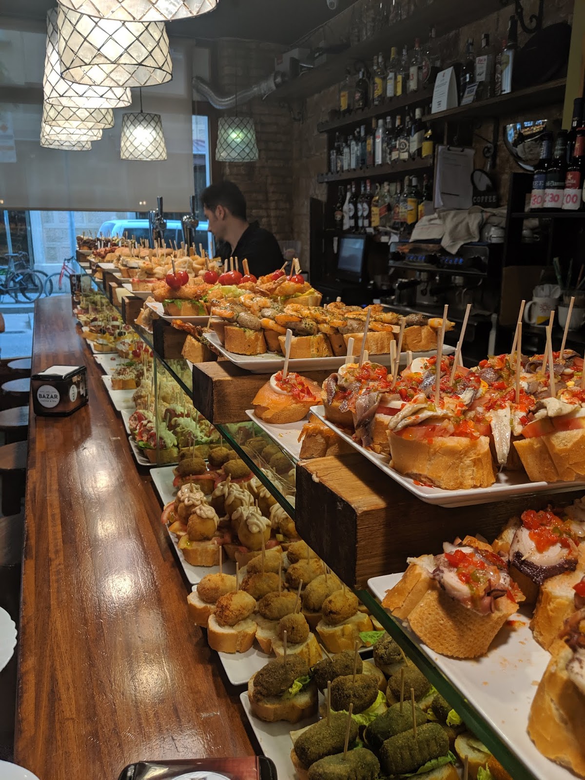 After our art search, we were hungry (again). We have been trying to do intermittent fasting since we got to Spain, not eating from 8pm-12pm. It has been a bit of a challenge because we try to cram all our eating into such a short amount of time, but it has it’s benefits, especially when we aren’t working out as much as we would like. Anyways, we walked to a street that basically specialized in tapas. I had never seen anything like it. Every single bar on the street had their entire counters covered in these small, delicious foods. I’m relieved we didn’t visit this street earlier because I think I would’ve had to go there every night.