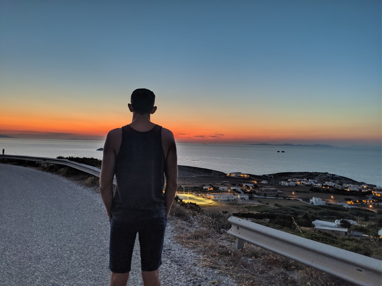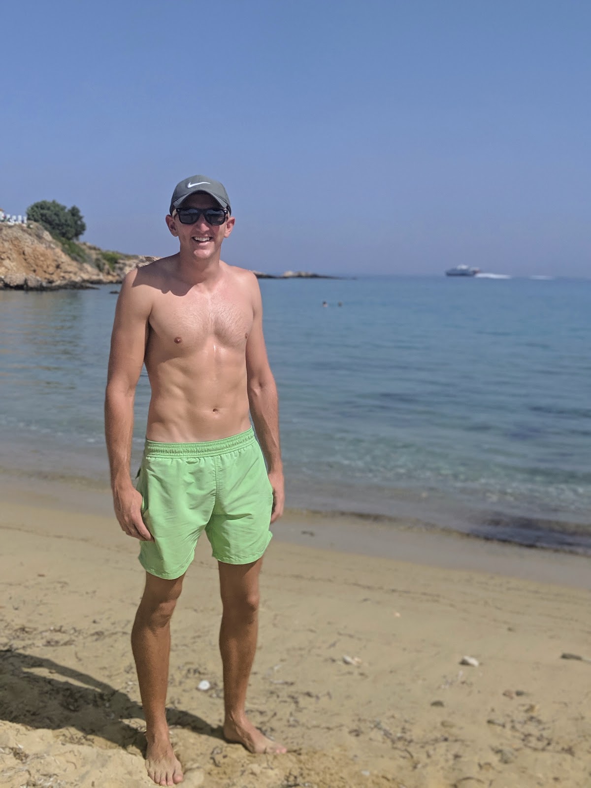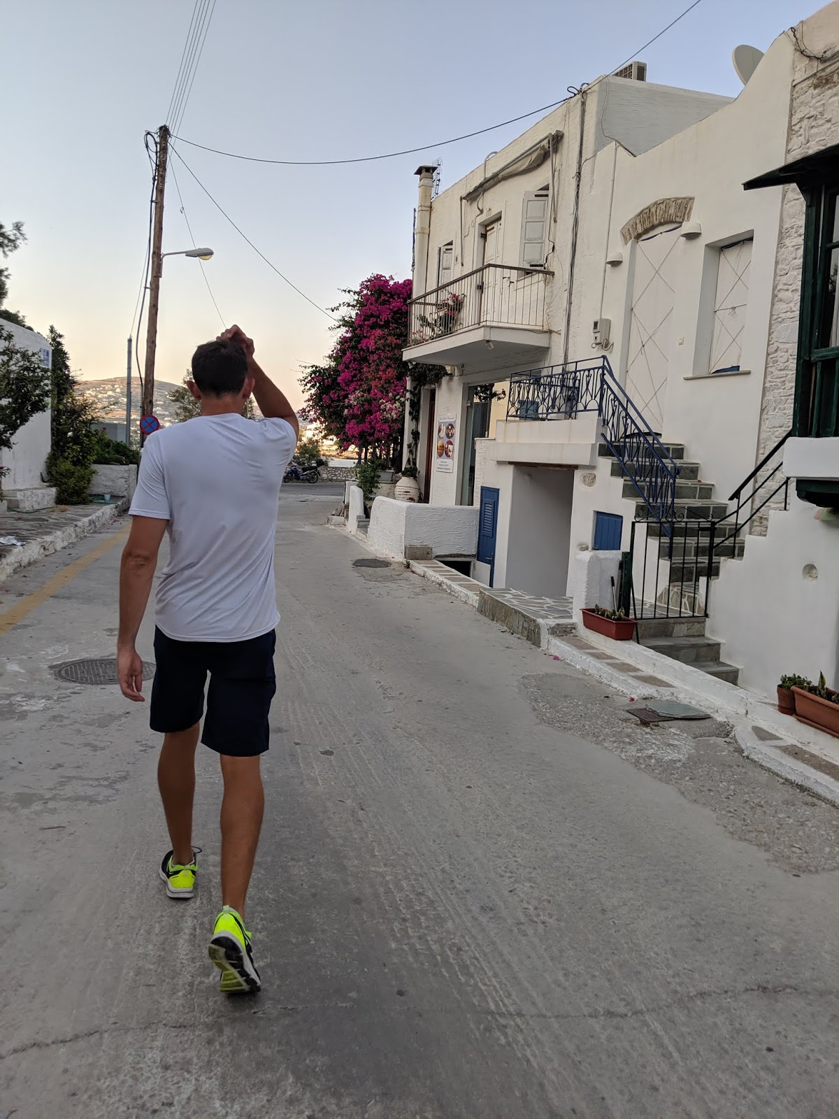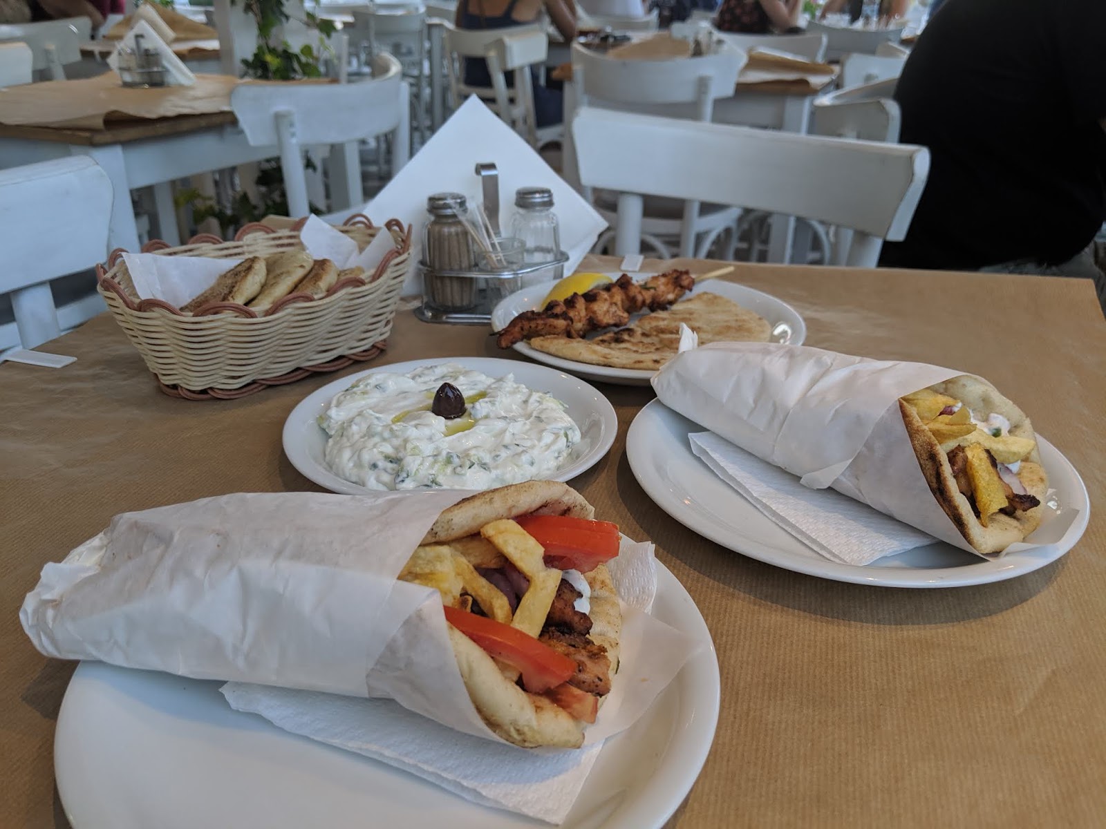 After dropping off the water we headed to the local beach a short walk from our apartment. The water wasn’t as cold as it had been in Barcelona, it was perfect to just lay and float for an hour or two. Plus the scenery was unbeatable. Looking back onto the island we saw bright white houses snuggled up to the mountains of Greece, with bright blue sky and water as the backdrop. We both agreed that Greece would be a place worth coming back and island hopping. On our way back from the beach we decided we would do a quick workout before heading into town for dinner. It had finally cooled down a bit so we were able to do our own workouts and then walk to dinner peacefully. We had such good luck with our lunch spot, we ate there for dinner as well! The food seemed pretty healthy and we didn’t feel bad after eating it, so it was a win-win overall.