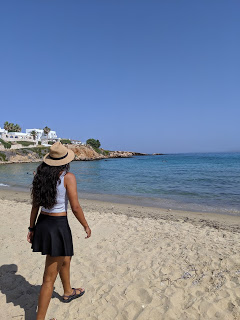 We arrived into Paros via ferry mid afternoon. As soon as we got off the ship, we were greeted by our Air bnb host. It was really warm on the island, so we were thankful to not have to walk with our packs 45 minutes to the apartment. The drive was quick and as soon as we pulled on to the road for the bnb we knew we were in paradise. It had the classic Greek look, all freshly painted white with blue accents and bright flowers laced throughout the walkways and windows. We were led upstairs to our small apartment equipped with a kitchen, our own bathroom, air conditioning (thank goodness!) and our own ocean view patio. After settling into the space, we met with the hosts wife and she told us all about the island, good beaches to go to, yummy restaurants, and helped us with the impossible to read bus schedule.