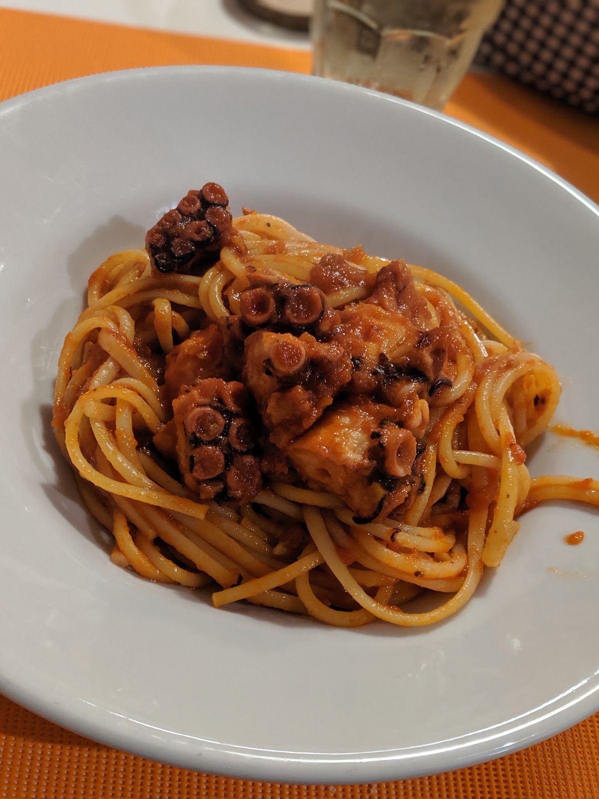 Our meal started off with two types of fresh bread, one was like a cracker and the other a traditional french bread. The host told us that the cracker is traditional food because people would bring it up into the mountains with them with no fear of it getting stale as quickly as a loaf of bread. Served alongside the bread was a small container of fresh roasted veggies and olive oil, we could’ve eaten it by the jar fulls, it was so good! We ordered fresh pasta, Scott’s with a spicy red sauce and octopus, mine with a pistachio-tomato sauce and giant prawns. Probably one of the best meals we’ve had this entire trip.