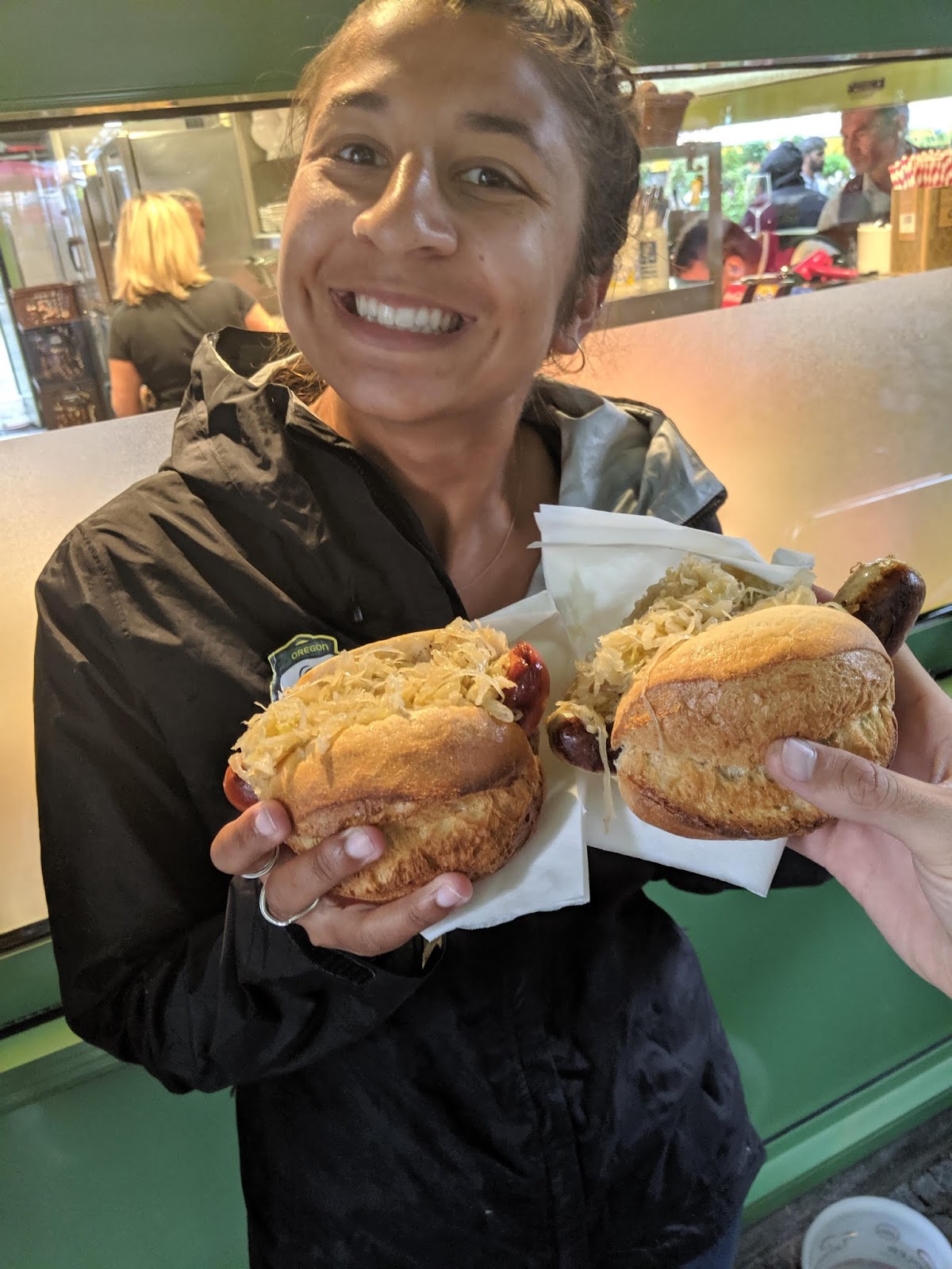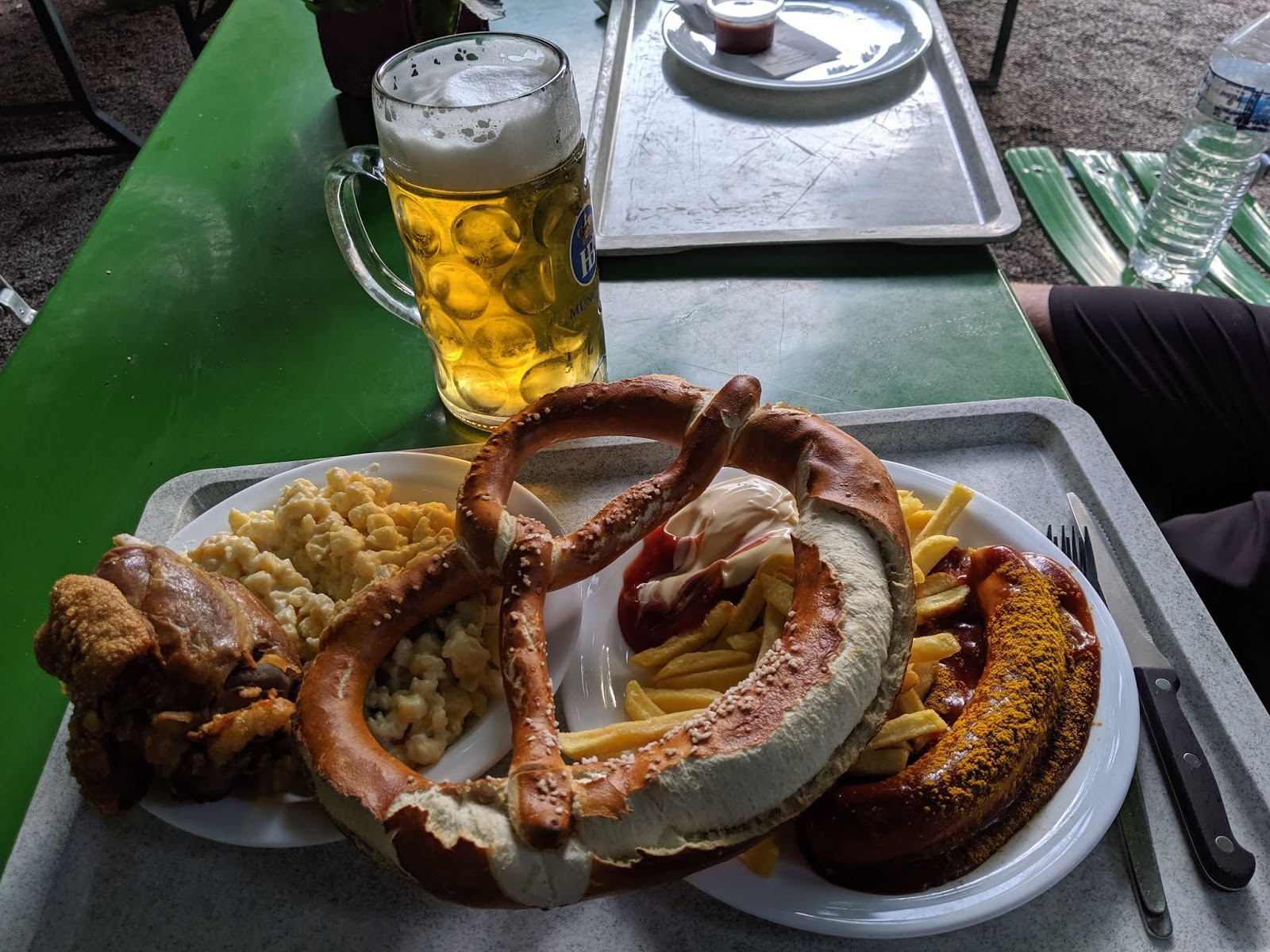 To say we were excited about the food was an understatement. We were a bit overwhelmed with the options, so of course we over ordered. Pictured middle school cafeteria lady service is how most beer gardens are laid out. You point to what food you would like and they plop it on your tray. It doesn’t sound so glamorous, but we loved every minute of it. Scott got pork knuckle, spetzel and cheese, and a massive beer (because when in Germany, you must drink beer like water) and I enjoyed curry-wurst, a pretzel bigger than my head, and fries. If you know me really well, I get unreasonably emotional when it comes to food, so Munich was a lot of smiling with my eyes closed while munching happily on everything I could get my hands on.