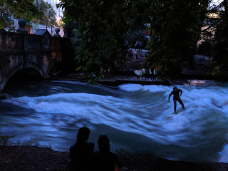 After our dinner, we walked through the park and watched the river surfers. I had never even heard of such a thing, but apparently it is super popular in Munich. Basically, these super fast moving rivers have a giant piece of rubber attached to a nearby bridge that works to form a wave underneath the water (not the best description, but it is hard to describe). Locals in wet-suits push off of the edges of the river and into the waves on short surfboards doing their best to hold on to a wave before being swept downstream. We saw all different levels of expertise and it was pretty captivating to watch. Something I wouldn’t do though!