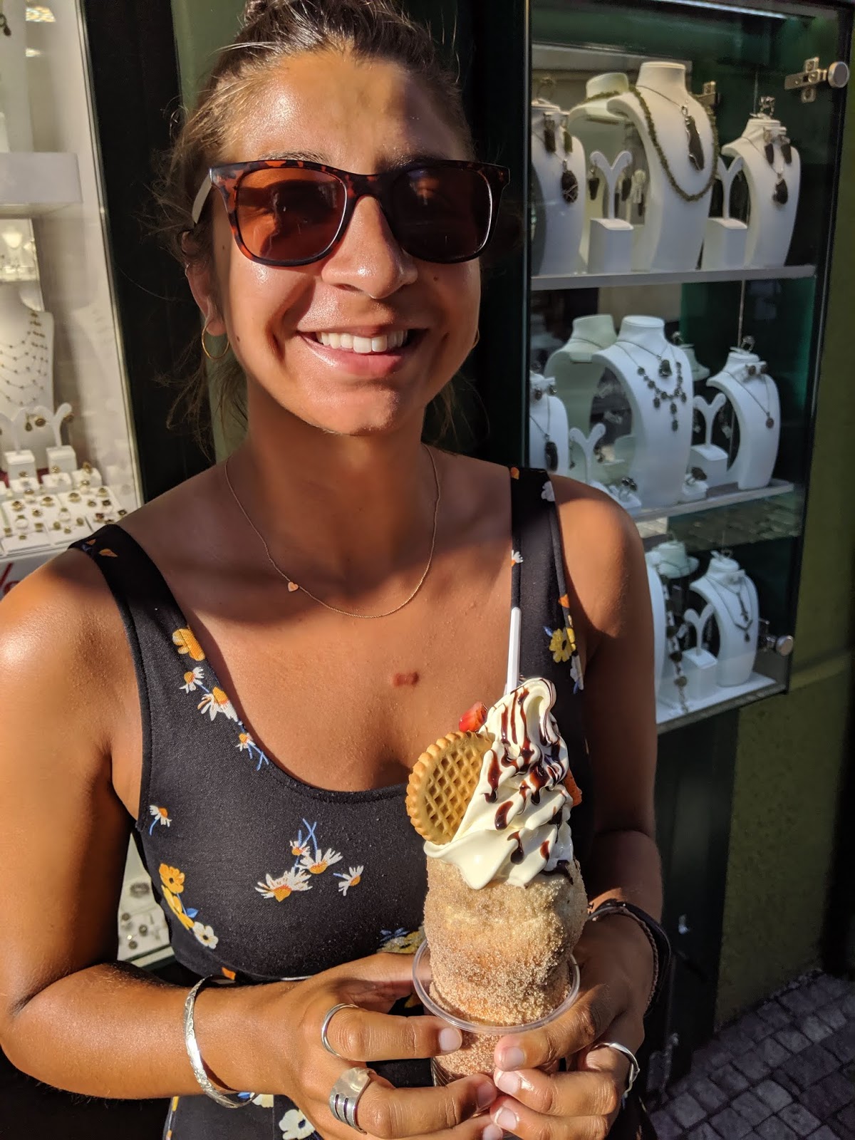 Our evening ended with some decent ramen and a treat known in Prague called, Trdelnik. Think of dough wrapped around a thick rod roasted over a hot flame. Then it is knocked off the rod, rolled in sugar and then stuffed with your fillings of choice. We went for the strawberries and vanilla ice cream with chocolate drizzle and it was to die for. Everything you could want in a warm pillow-y dessert with refreshing creamy, fruity center. That wasn’t our last trdelnik of the trip, that’s for sure.