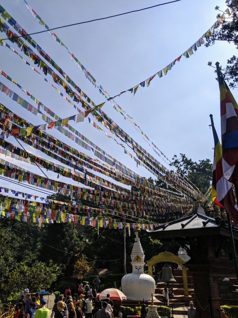 We spent the next day going to the monkey temple (lava cake on the way) and wandering around the touristy area of Kathmandu. I’ve learned after encountering monkeys in the last few places we’ve been, that I am not the biggest fan. Not because I don’t like monkey in general, I think they are cute and how human-like they fascinate me endlessly. BUT they are so smart and so unpredictable I am waiting for the day that one of them takes Scott’s phone right out of his hands OR if we meet a not-so-friendly one and it bites one of us and that just throws a wrench into this whole travel thing. Scott makes fun of me every time we encounter them, but he does manage to get some extraordinary pictures of them. Anyways, we walked up to the free entrance for the monkey temple (Rose gave us insider advice) because apparently all other entrances you have to pay. After climbing up the stairs and realizing how out of shape we were, we walked around saw millions of peace flags, and watched monkeys divebomb into a pool of water to show off. Cheeky little animals, they know how to please a crowd.