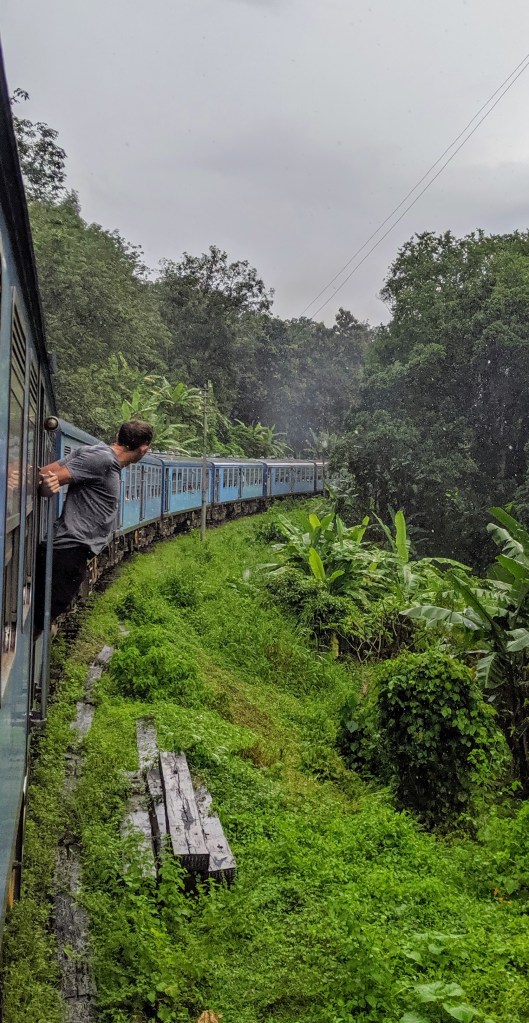 The train traveled through the tropical rainforests of Sri Lanka with small towns and stations doting the way. People selling things out the window at stops, children waving as you cruised by, and lots of smiles the whole way. We sampled more spicy, creamy, sweet chai and munch on our snacks. Scott and I even took advantage of hanging out of the open doors of the train cars, taking pictures, feeling the breeze on our faces and through my hair. It was a bit of adrenaline rush.
