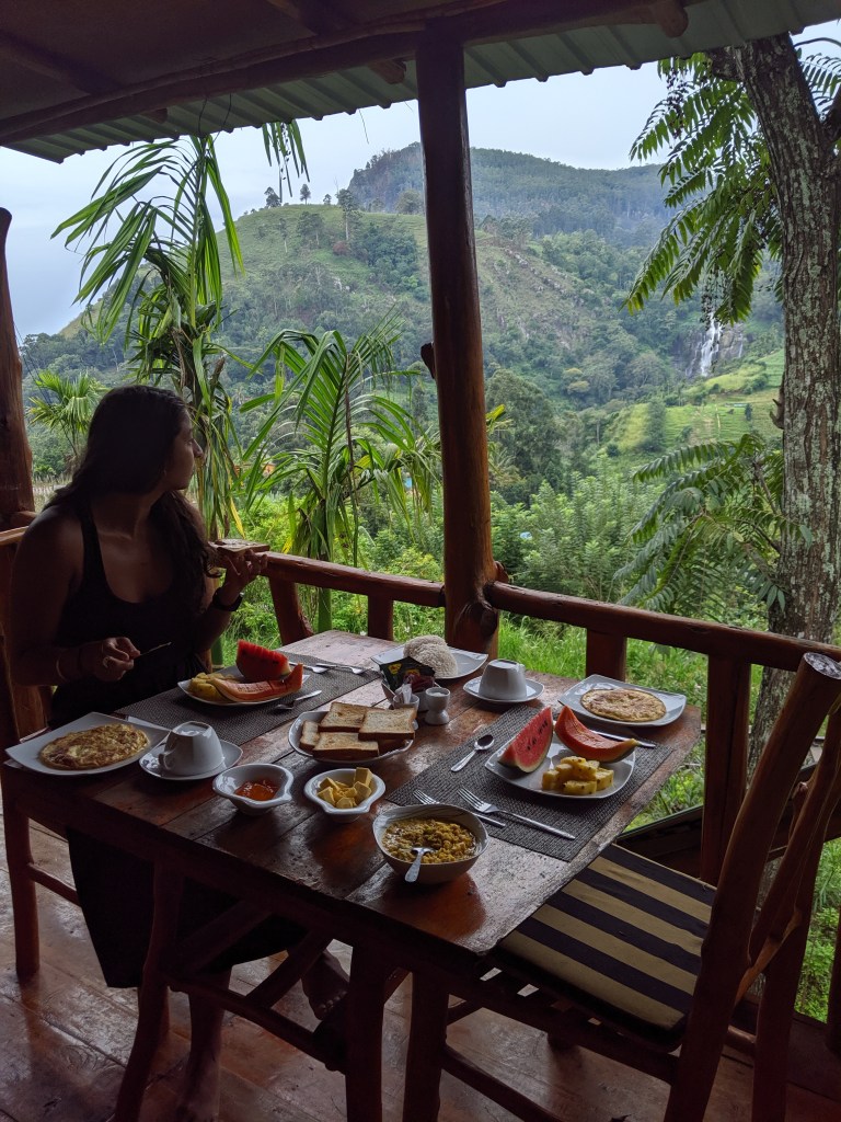 In the morning Scott was sold on the place, before I could even get out of bed, he was negotiating another night at this place with the manager (cutting our time in Tangalle one night short, but that’s okay). The manager gave us a deal because it is slow season, so we decided to do some planning with our extended time in Ella. I forgot to mention the view that sold Scott. When we woke up and walked out to our patio it over looks the valley of tea plantations, surrounding mountains, trains running through the rain forest, Ella rock, and a massive waterfall just a few thousand meters in the distance. Monkeys bounced from tree to tree in search of jackfruit around our cabana and they even made a few guest appearances on our breakfast table. The only downside of the place is the bugs, they are EVERYWHERE. But, with that I got to see my first ever firefly, totally captivated.