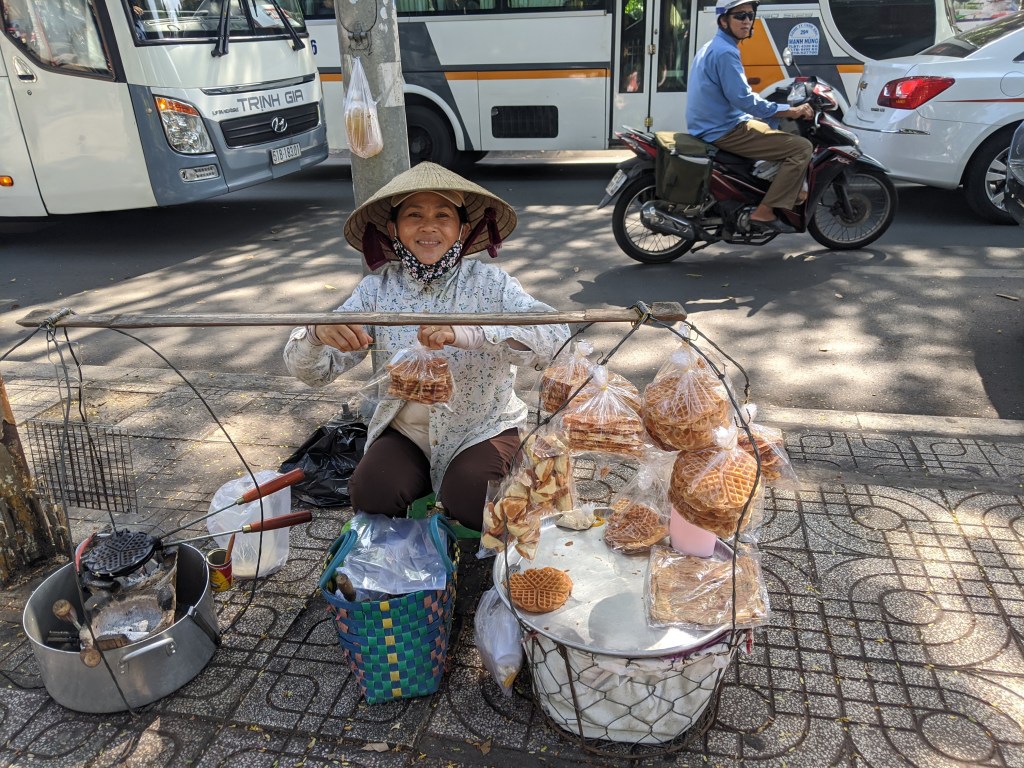 On our way home from the air bnb we walked past a woman squatted down over a small fire with coals and cast-iron presses resting on the top. We noticed she was selling these things that looked like flat waffles for just a dollar, so might as well try it. They turned out to be a crispy, sweet cookie, kind of like a flat fortune cookie, that were so addictive. The rest of our travels in Vietnam (3 weeks in total) we searched for these cookies again, and to no avail. I’ve even tried google-ing them, but I think they were a random special treat that we’ll have to savor in our memories forever!
