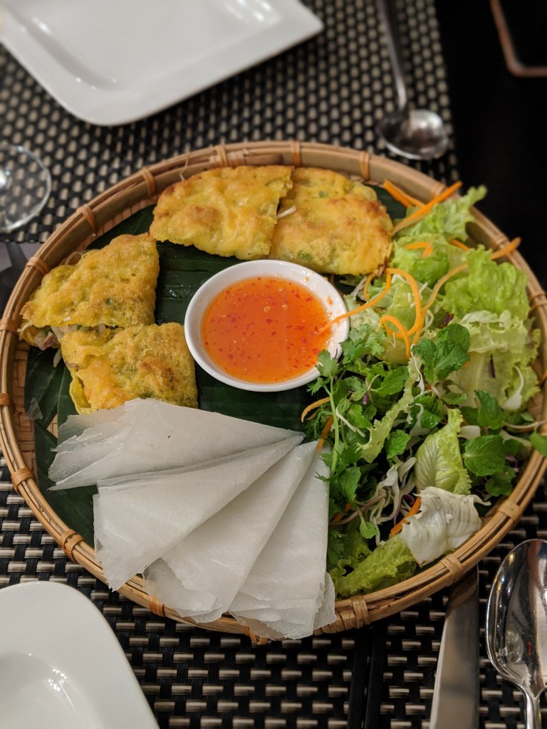 Each day one of the hotel staff would chat with us about our plans and wondered if we were content with our visit. They were so kind and always telling us they wanted us to feel like family there. Apparently, they don’t get many Americans so we were told to tell all our friends, so here it is: If you are going to Da Nang, stay at Monarque, you won’t regret it! I’m not just saying this, it really was fantastic. We were offered complimentary massages, they made us a cake upon arrival, and our last night the chef prepared us a special five-course meal, paired with wine, on the house. We had traditional mango, shrimp salad, chicken rice, hot and sour soup, Banh Xeo (Vietnamese crunchy pancake with veggies and meat), and creme brulee. They may have been trying to butter us up for their American clientele, but it worked!