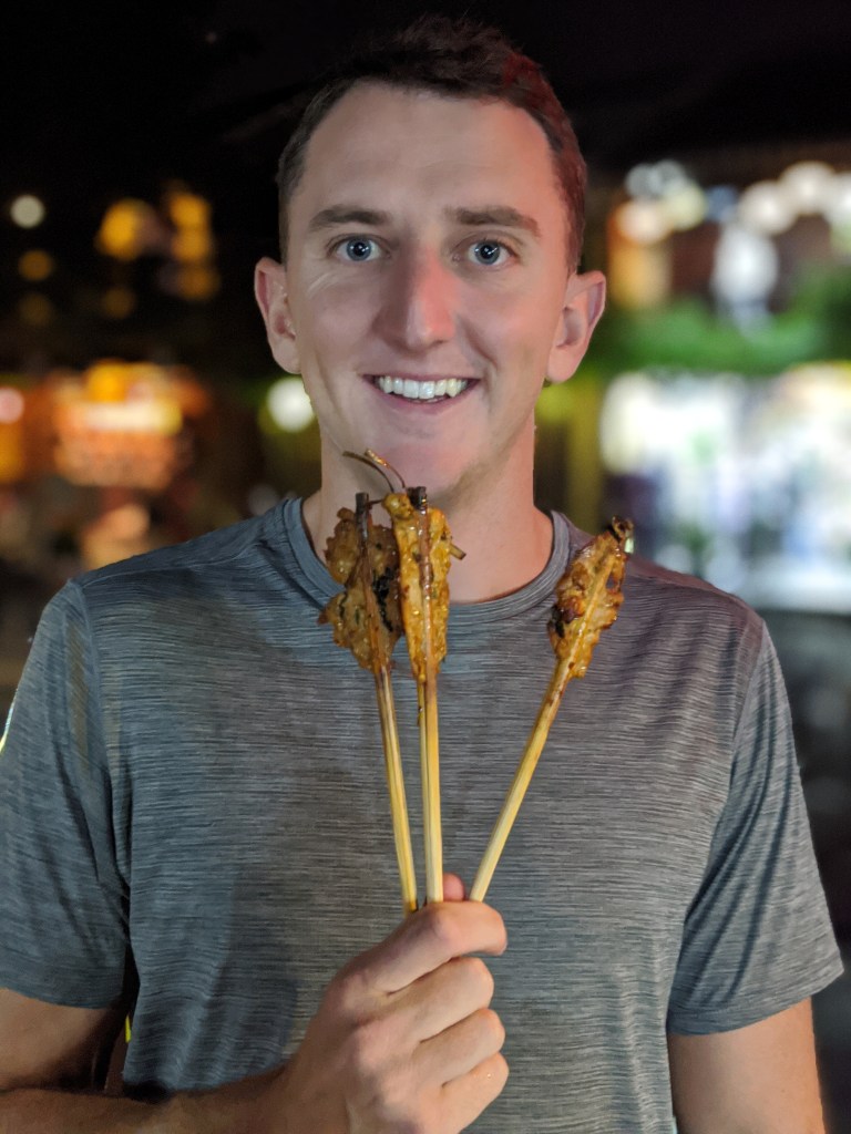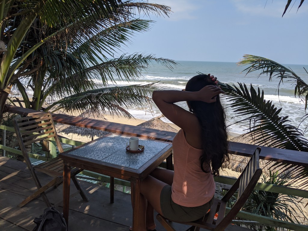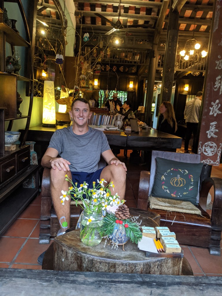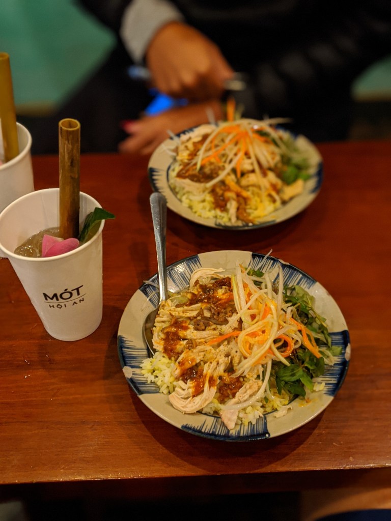 During this time in Vietnam I was pretty immersed in studying, my tests were coming up quickly and we were going to see my family in Malaysia right after I finished, so head in the books. When I wasn’t studying, I joined Scott at the gym down the street, we would go to coffee shops (where I would study some more) and we found some delicious food spots. A few in particular were Mot Hoi An, the unnamed food market at the beginning of walking street, and a sweet little tea house called Reaching Out. Mot was known for a sugary ice tea drink (tasted like honeycrisp apples and cinnamon) that every tourist we saw had, but they also had amazing chicken rice and a Hoi An specialty, Cau Lau. Cau Lau was also the dish we ordered from the food market, it was made of thick, gummy noodles, like udon, with a brown broth, veggies, pork slices, and fried pork strips. Delicious, and unique to Hoi An. Reaching Out tea house provided a sweet tasting tea, a biscuit set and unique decor. We realized that the tea house employs disabled local people that can not speak or hear so in order to communicate we used small blocks with words written on them. It was a very neat experience and the biscuits were good too!