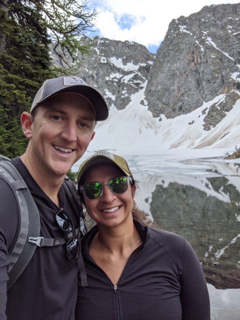 We were hoping that day to make it to Idaho, but it just didn’t seem like it was going to happen. It would’ve been way too much driving and we were already pushing it. So we followed a route that Susan had helped us devise. The first part of the drive was gloomy and honestly not a great kick off to this around the country road trip. Scott was eager to go hike and I was not about it in this total downpour. Somehow, someway, the clouds parted as we were going through the last few miles to the trailhead. We got to actually take in the beauty of this hidden gem of a national park (again vowing to come back). The trail we decided to hike was called Blue Lake Trail. We read on AllTrails (highly recommend this app if you like to hike, the reviews are so helpful) that the last bit of the trail is still snowy so we decided last minute to throw our spikes in the pack (I am SO happy we did). With the help of Scott’s GPS watch and some trial and error, we climbed our way through the snow and mud to Blue Lake and it was every bit worth it. I don’t think many people make it all the way because of the conditions, but at the top there are massive cliffs to where a glacier meets a partially frozen lake, something out of a postcard for sure!