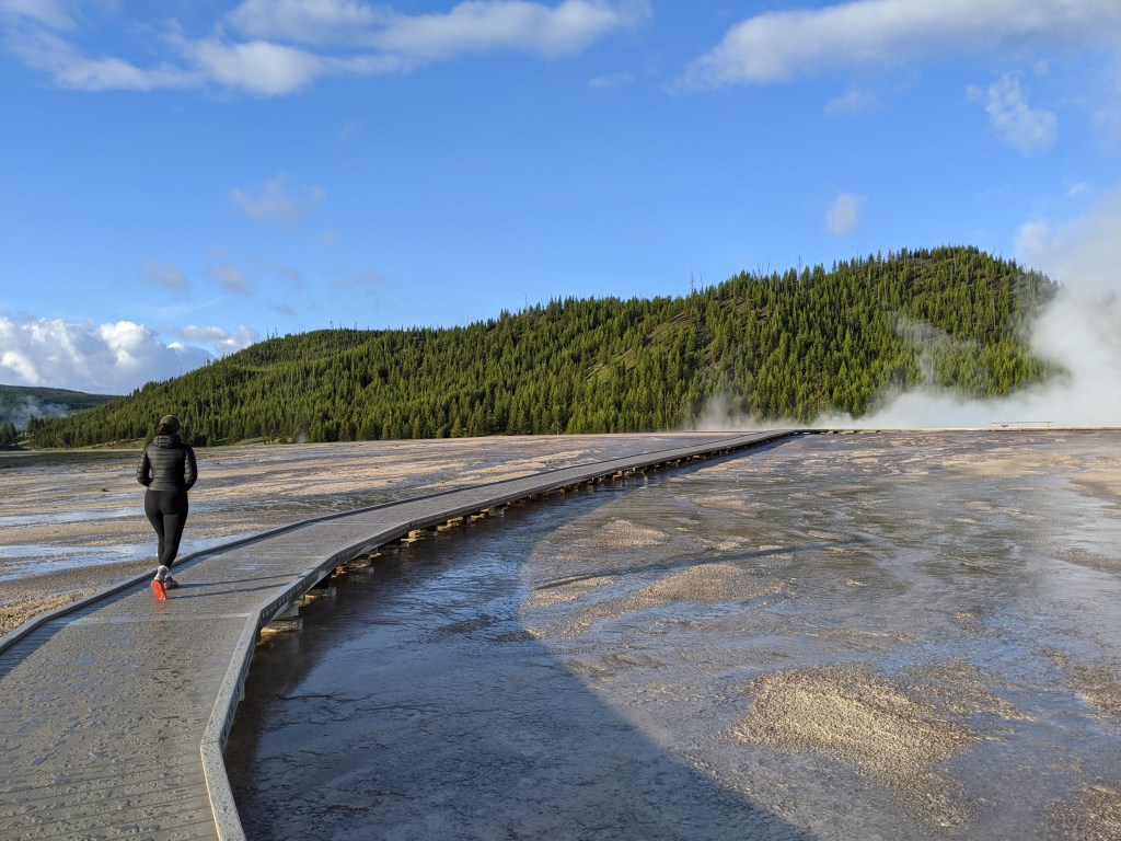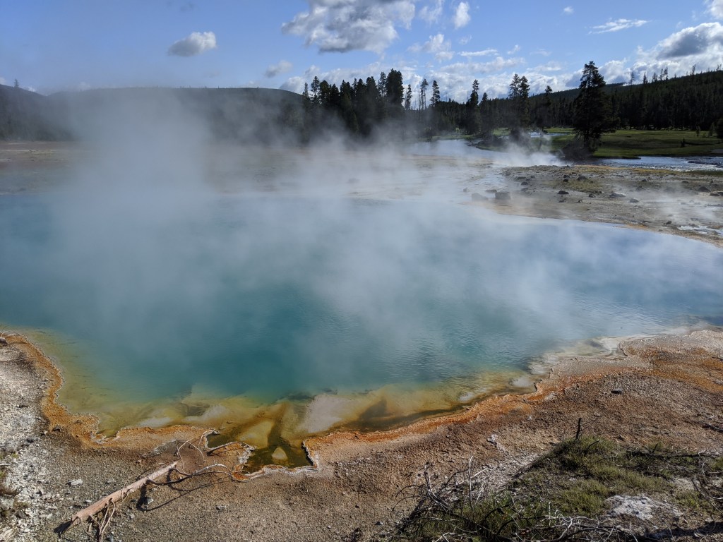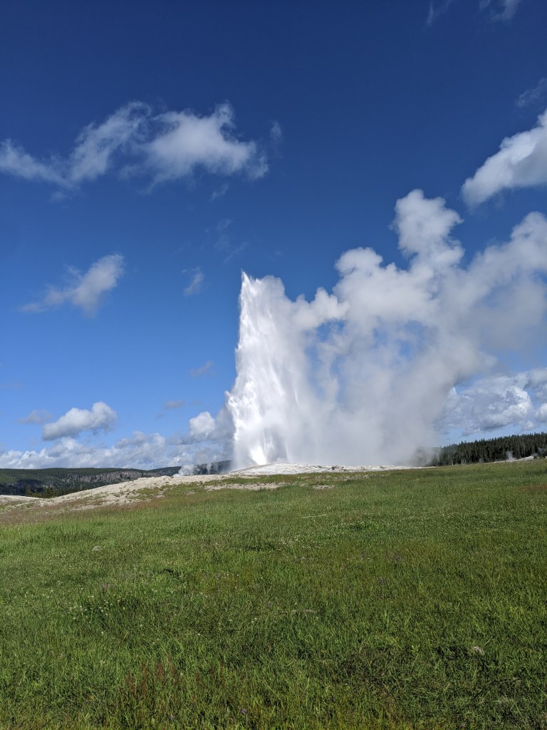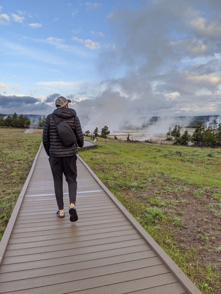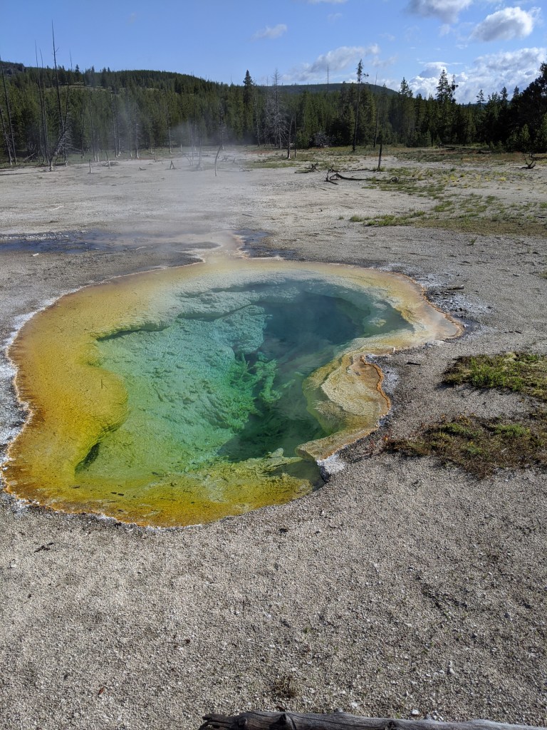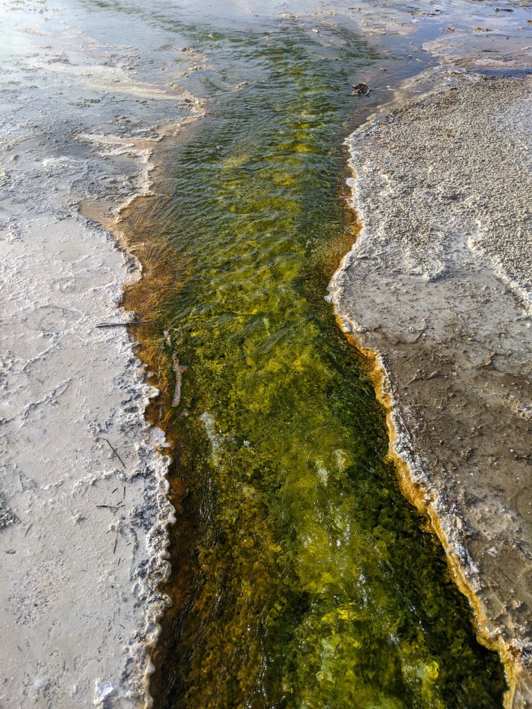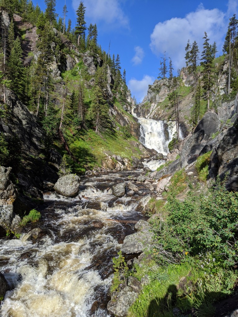 Our first few stops were Painted Pots, Grand Prismatic, and then a short hike to Mystic Falls. They were all different but kind of the same. Elements of geothermal pools, multicolored, and often smelly. These few places had yet to be over-run by people for the day. On our way down from Mystic Falls we could tell it was starting to get packed, cars parked everywhere and mobs of people flooding the trails.